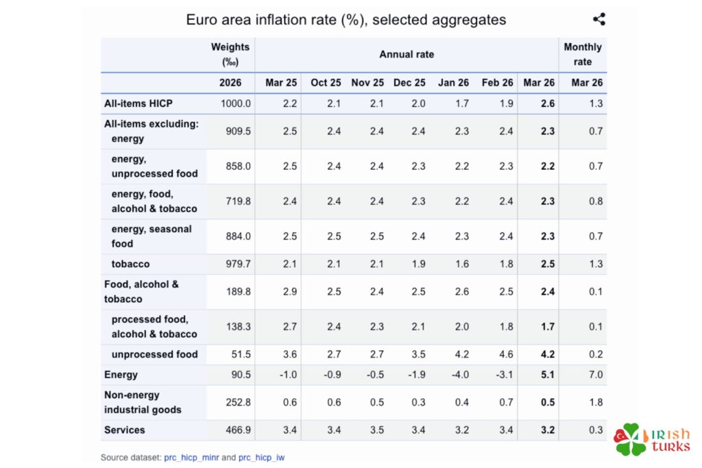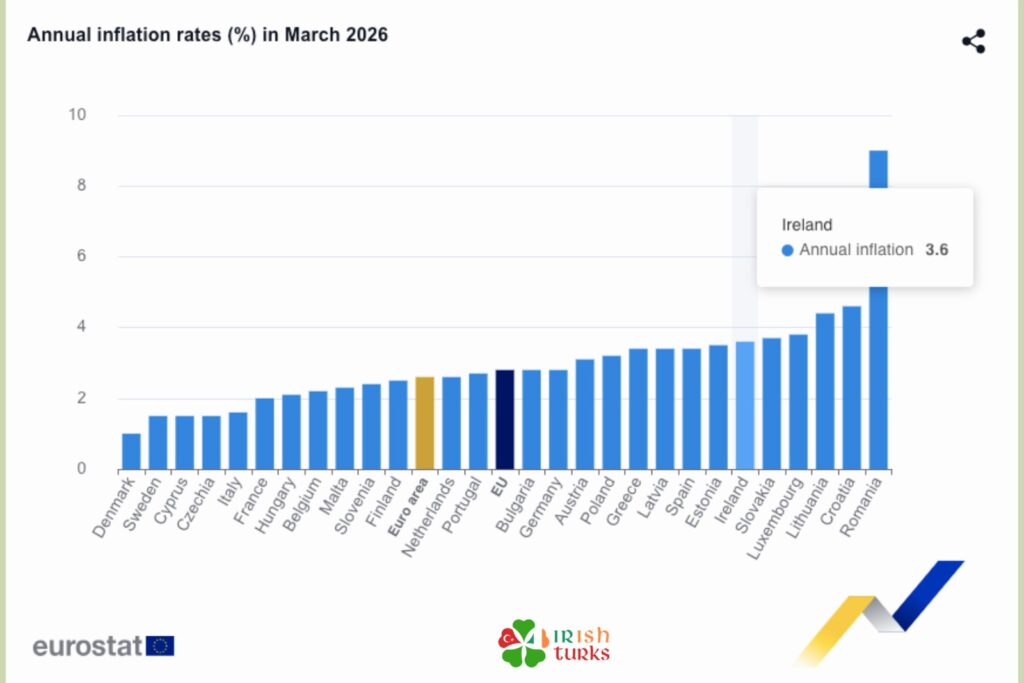 2026 mart ayı itibarıyla İrlanda’nın yıllık enflasyonu %3,6 olarak belirlendi. İrlanda’nın yıllık enflasyon oranı Avrupa Birliği’nin ortalamasının üzerinde çıkarken, İrlanda 29 ülke arasında en yüksek enflasyon oranına sahip 6. ülke oldu.